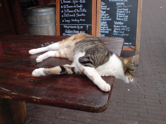 I am no dog person, I hate the bastards, but not really a cat person either. But I thought this cat was kind of funny, sunbathing on the terrace table of a restaurant.